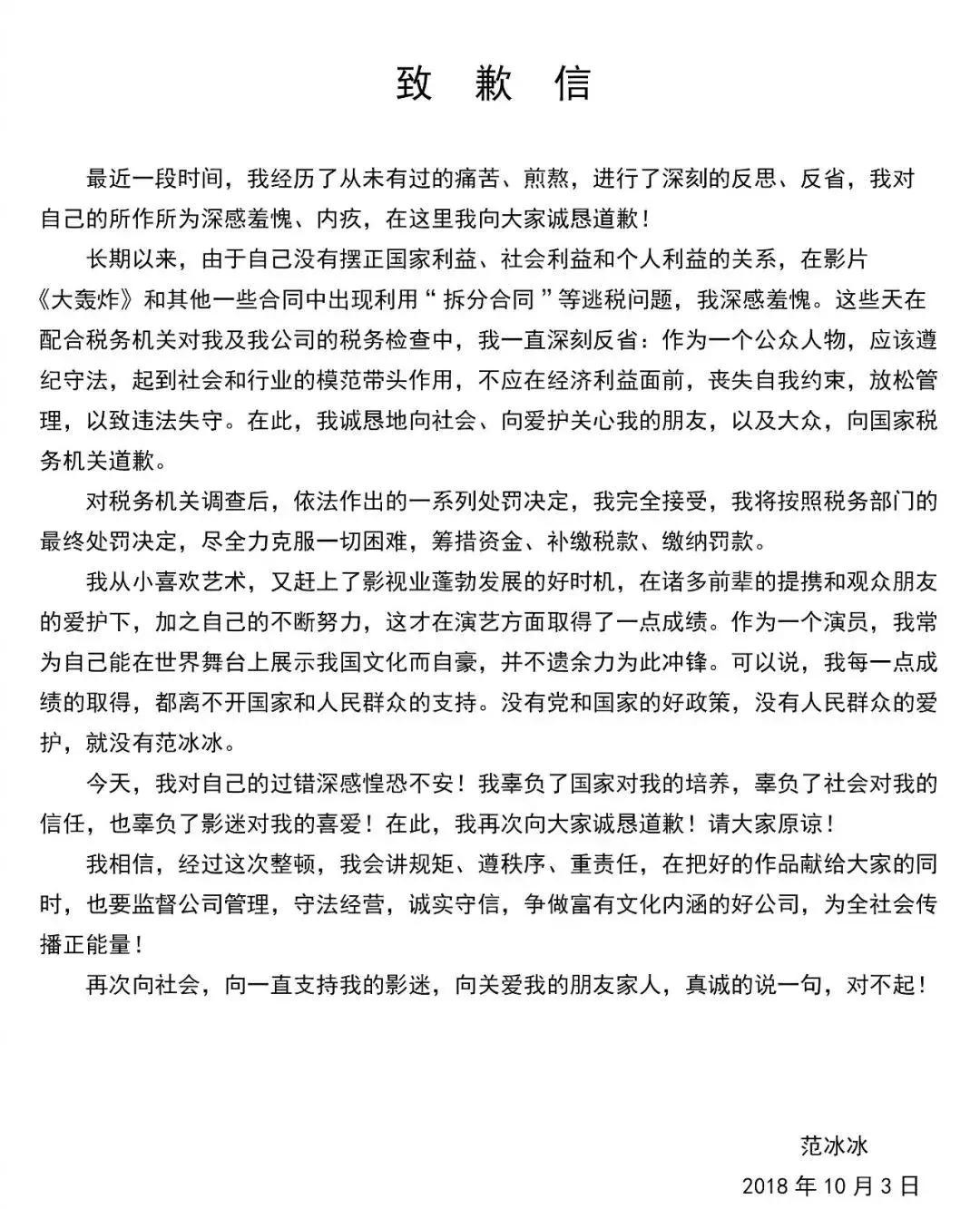 消失了123天的范冰冰,今天在微博上终于现身了!她发布致歉信,表示自己会“尽全力克服一切困难,筹措资金、补缴税款、缴纳罚款”。