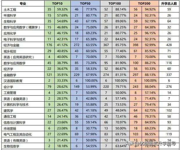 据统计,经济与金融、金融数学、会计学三个专业的升学人数最多,其余各专业升学人数如下所示: