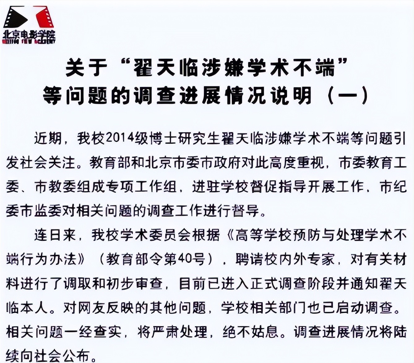 短短几天的时间,就查出了翟天临学术不端行为,北影学院宣布撤销翟天临的博士学位,就连他的导师也因此取消了博导资格。