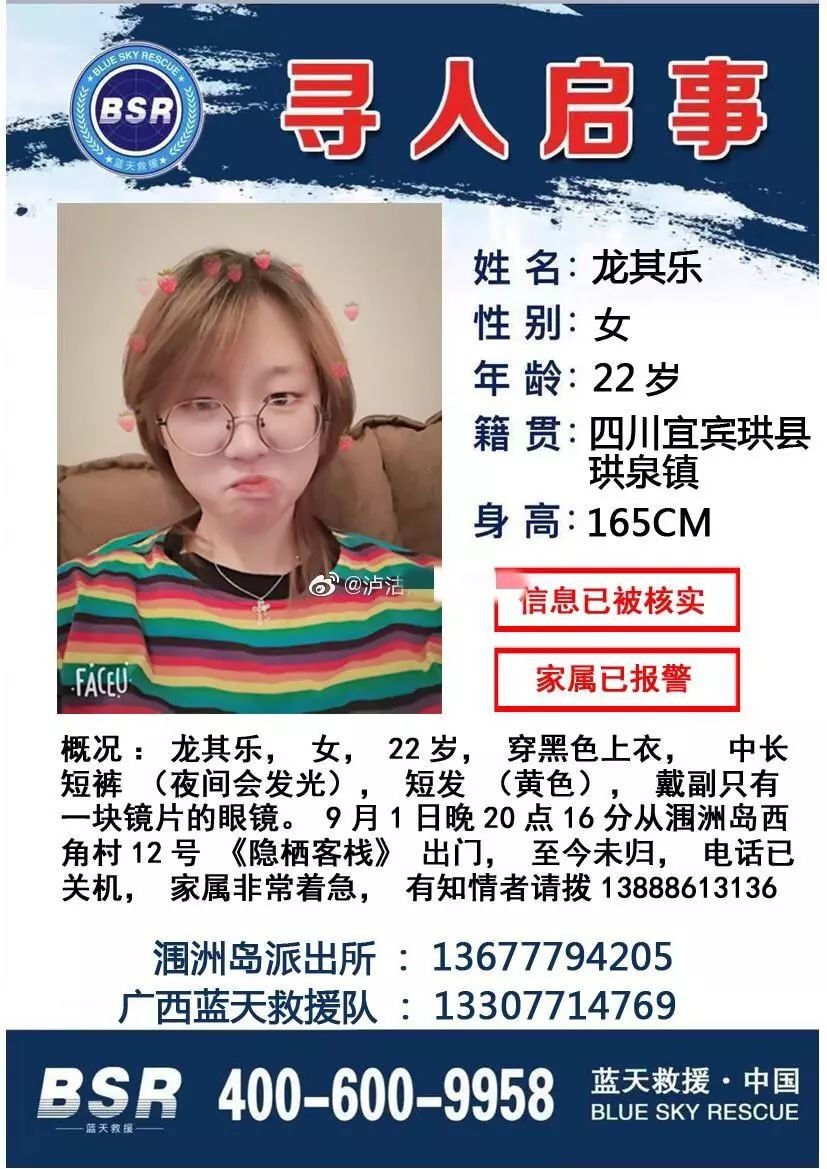 失联女孩龙其乐,22岁,四川省宜宾市珙县人珙泉镇人,身高1.65米。失联前身着夜间会发光的短裤,蓄黄色短发,戴一副只有一块镜片的眼镜。