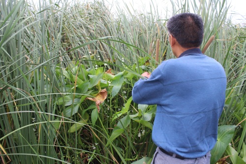 长在香蒲(蔺子)中,头两侧是蒲棒,香蒲的雄花粉就是中药蒲黄