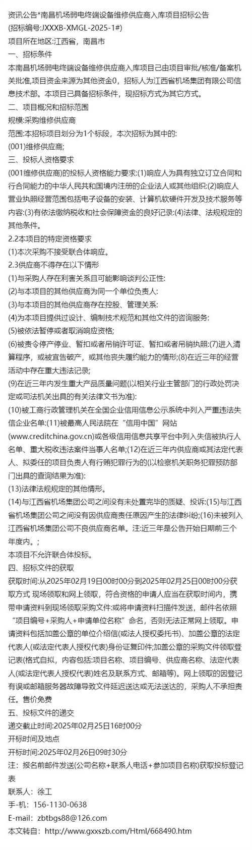 关于2025年度*南昌机场弱电终端设备维修供应商入库项目招标公告