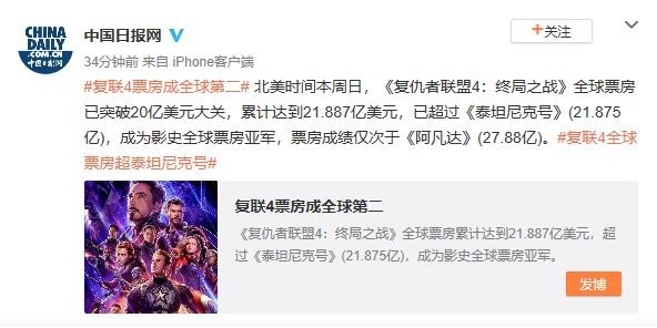 北美时间本周日,《复仇者联盟4:终局之战》全球票房已突破20亿美元大关,累计达到21.887亿美元,已超过《泰坦尼克号》(21.875亿),成为影史全球票房亚军,票房成绩仅次于《阿凡达》(27.88亿)。