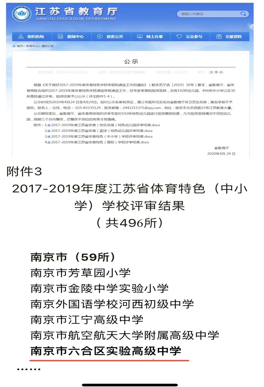 2020年4月 24 日,经江苏省教育厅、省体育局遴选,专家组审查和现场答辩,省教育厅正式公示江苏省体育特色学校评审结果,我学校名列其中。这是学校继获评全国学校体育工作示范学校、全国青少年校园足球特色学校、成功创建江苏省体育课程基地之后,又一项重磅荣誉称号。