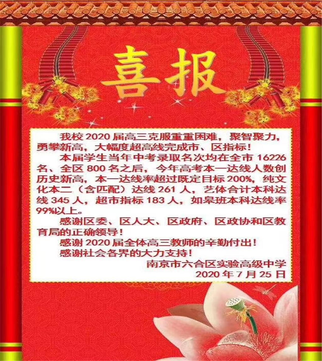 2020年高考超额完成了市、区两级下达的本科奋斗目标,文化、艺体取得双丰收!连续荣获普通高中教育发展性评估最高奖——综合奖、质量优秀奖、教学管理奖、特色建设奖、质量进步奖,是全区获奖最多的学校,并成为全市十八所(六合区唯一一所)经验交流学校之一。