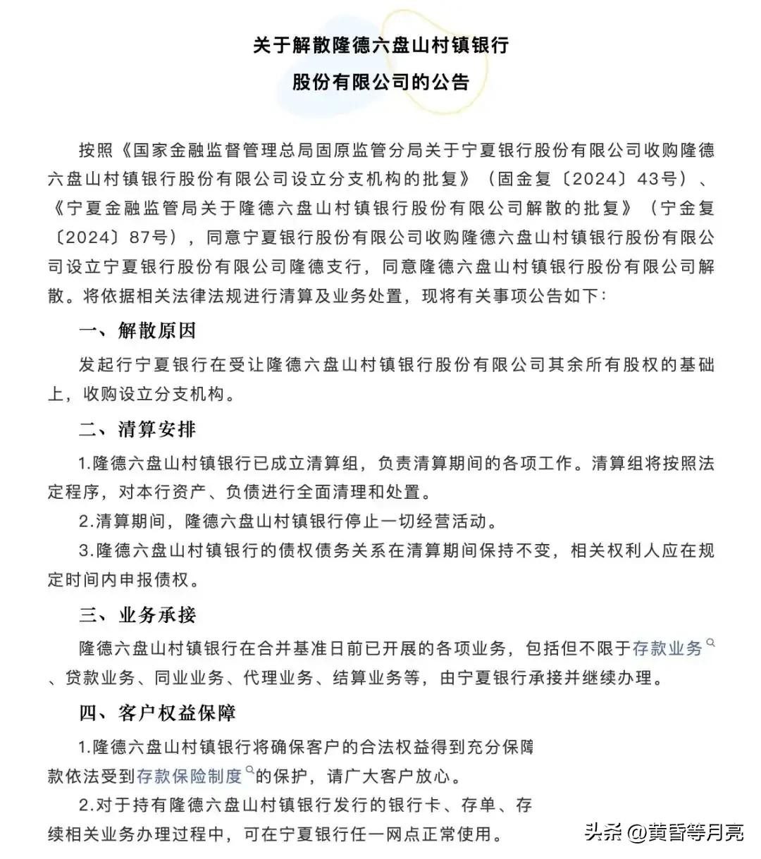 今年11月20日,宁夏金融监管局同意隆德六盘山村镇银行解散,并要求其停止经营活动,在规定的15个工作日内向固原金融监管分局缴回许可证。