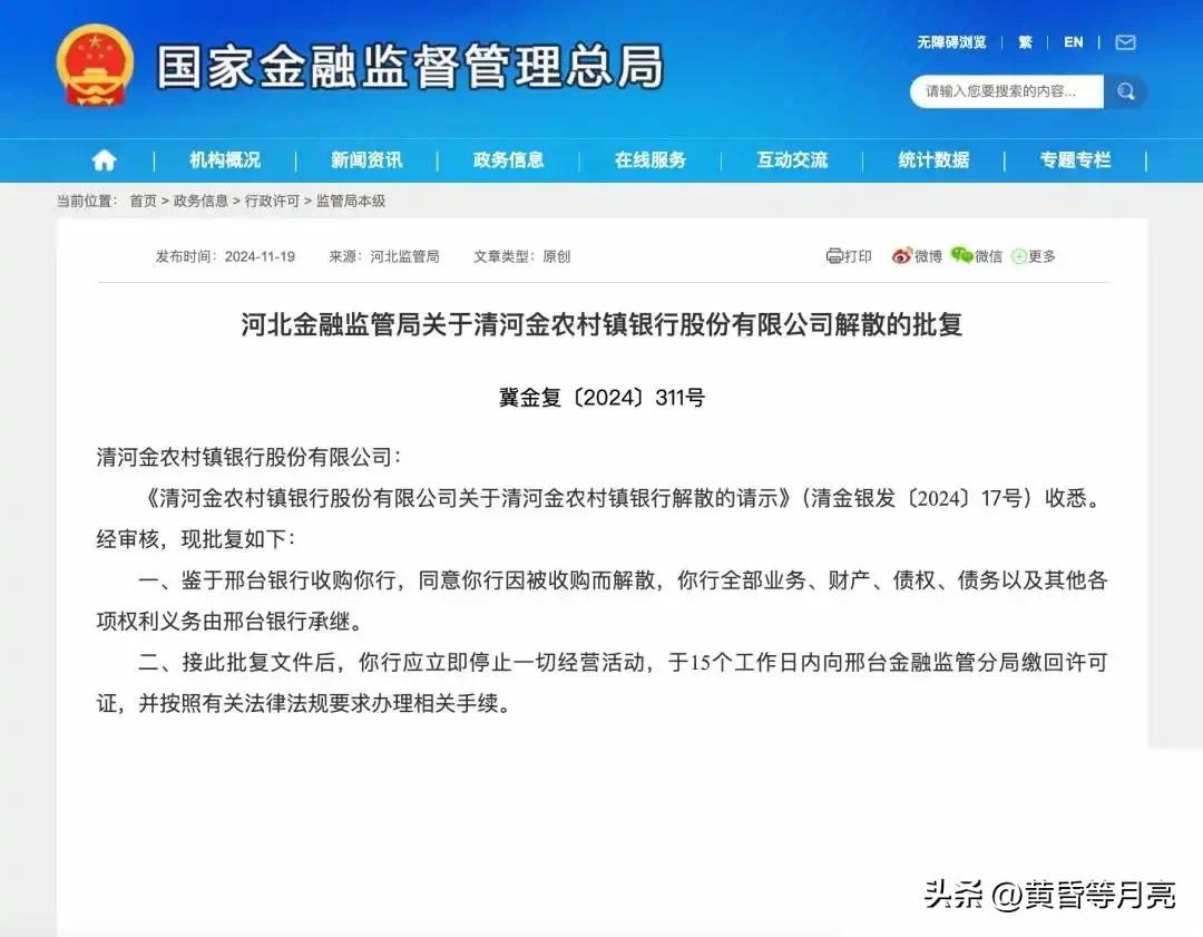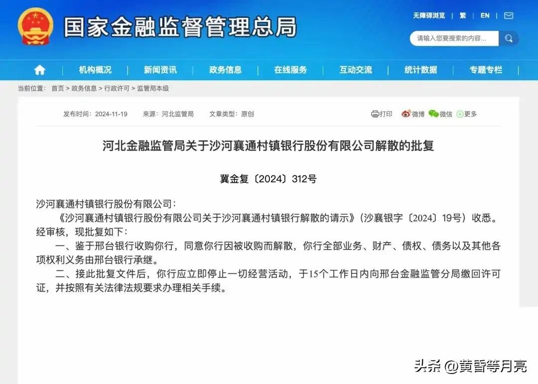 11月15日,河北金融监管局同意了两家村镇银行的解散申请,这两家村镇银行分别是清河金农村镇银行和沙河襄通村镇银行。