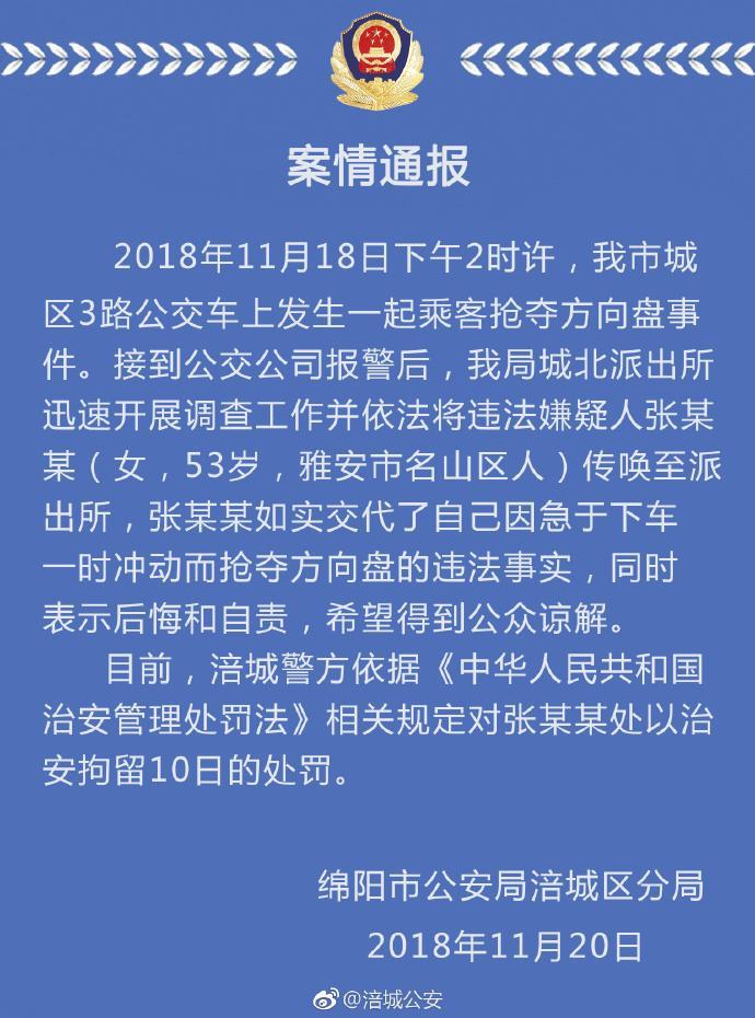 通报称,接到公交公司报警后,涪城分局城北派出所迅速开展调查工作并依法将违法嫌疑人张某某(女,53岁,雅安市名山区人)传唤至派出所,张某某如实交代了自己因急于下车一时冲动而抢夺方向盘的违法事实,同时表示后悔和自责,希望得到公众谅解。