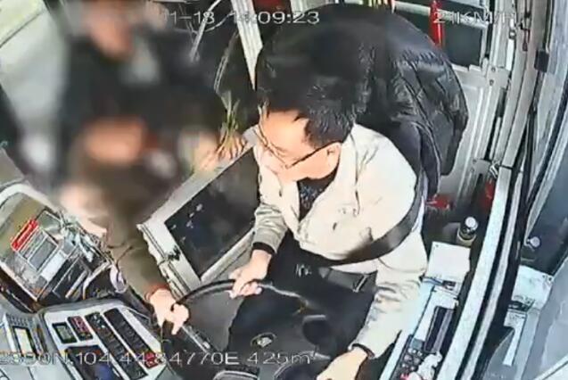 随后,公交车启动正常行驶,一名大妈情绪非常激动地来到司机旁边,嘴里大声说着什么,然后突然两只手使劲抓方向盘。旁边一名戴眼镜的男子急忙将该大妈拉开,司机也紧急制动停车。