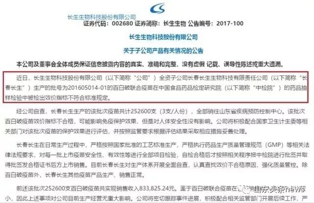 2017年11月,长生生物公告称,公司全资子公司长春长生生产的百白破联合疫苗在中国食品药品检定研究院的药品抽样检验中被检出效价指标不符合标准规定。