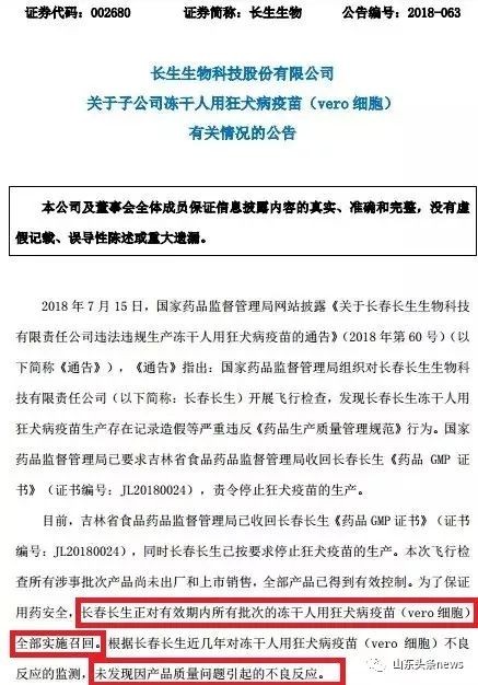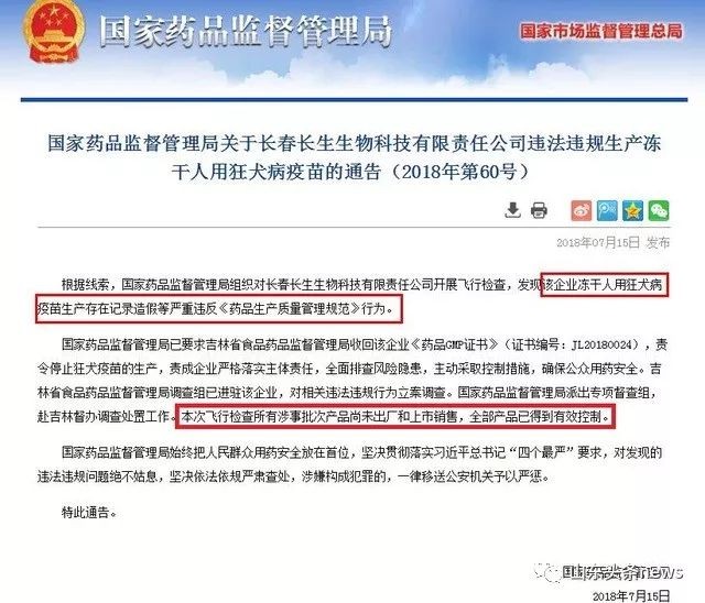 公告显示,国家药品监督管理局组织对长春长生生物科技有限责任公司(长春长生)开展飞行检查,发现该企业冻干人用狂犬病疫苗生产存在记录造假等严重违反《药品生产质量管理规范》行为。