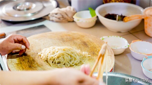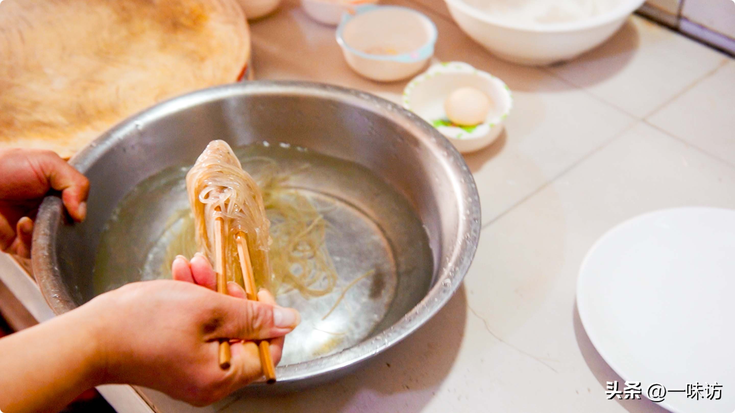 时间到了,我们把粉条用筷子夹出来放在菜板上。用刀把粉条切碎,然后放入一个盆中备用。