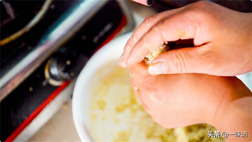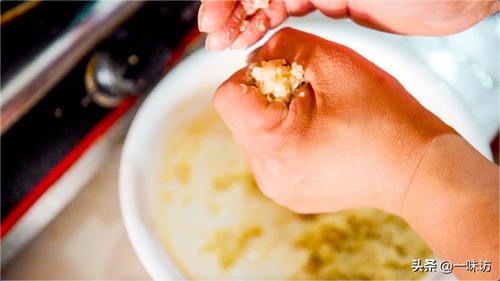 如果搅拌过程中发现比较干了,我们可以适当添加一些水。做好馅料后,待会我们只要用手握住一些馅用力挤出用筷子拨一下下入油中就能炸出一个丸子。如果你害怕被烫伤手也可以戴一个橡胶手套之类的保护手。