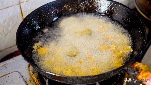 然后把火调大一些,当筷子下入锅中冒泡速度变快时,此时油温大约在7成热。我们把盆中备用的丸子重新下入锅中,快炸一下。