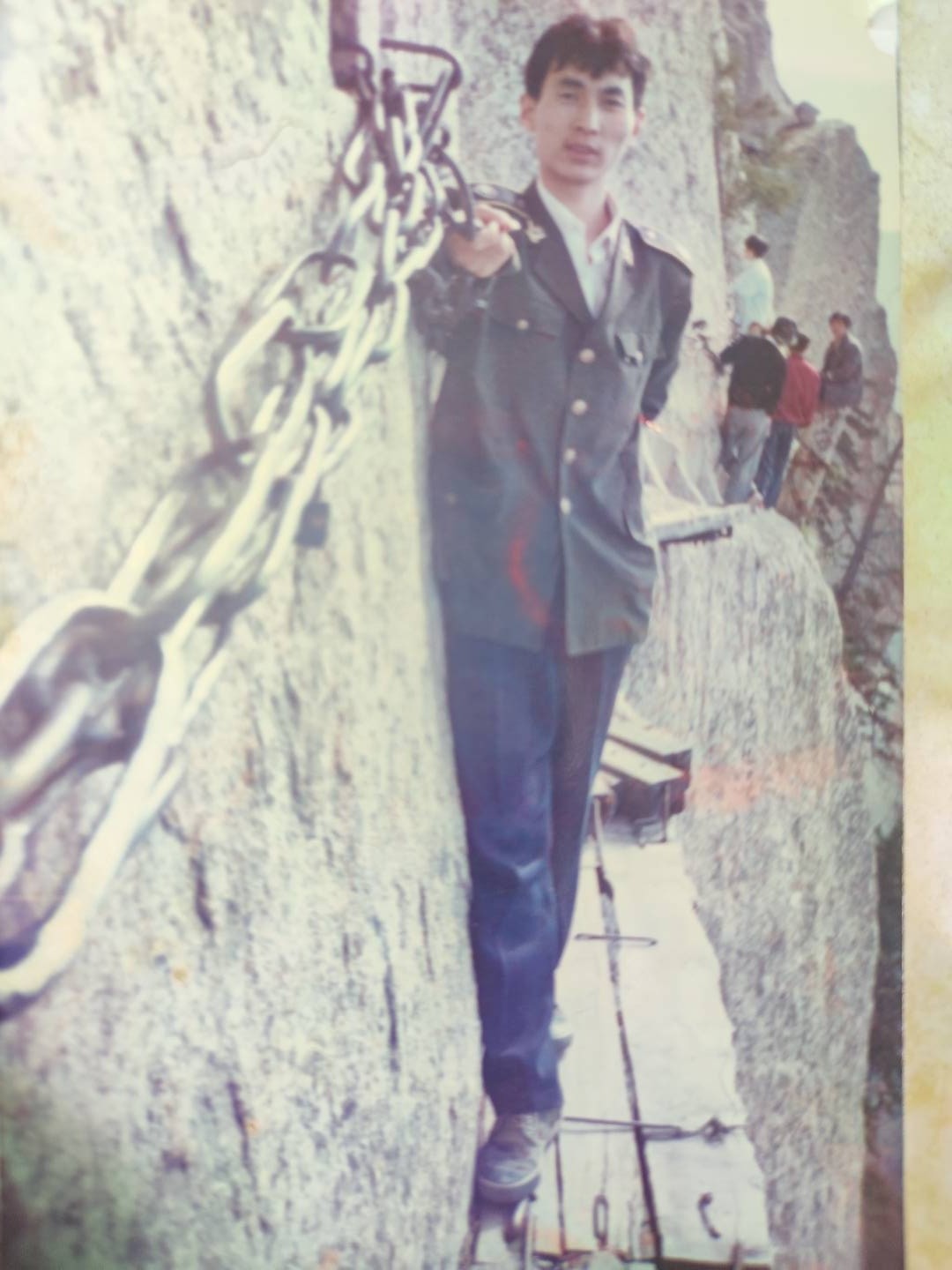 最刺激的是栈道来回的人相遇,胆子大的从外边过,胆子小的趴在悬崖上不动。有个大姐背了一个很大的包,我从外边过,绕着她,我的手勾了半天,才勾到她那边的铁链,那时候没有安全绳。
