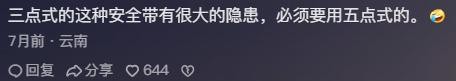 应该换五点式安全带,这个三点式安全带很危险的。大家外出去外地旅游时,要是看见景区高空危险项目的保护措施是三点式的有多远躲多远,但凡失足就很可能生死有命。