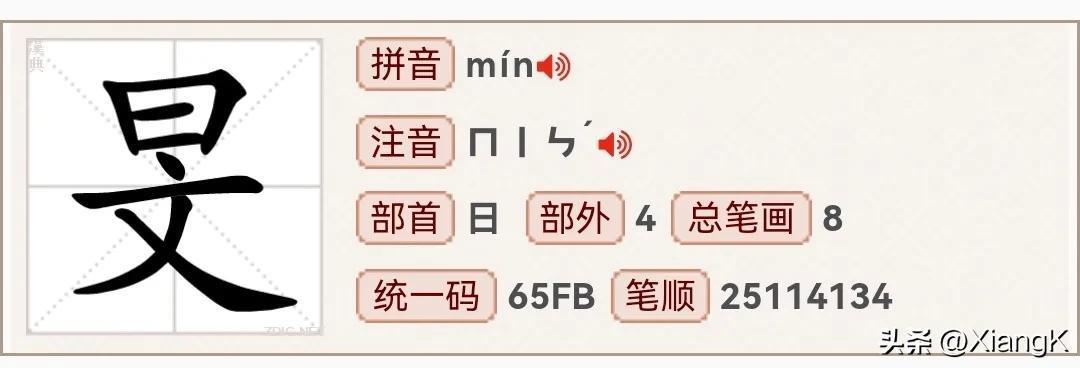 读音:【mín】、同音字:民、部首为日、总笔画8、结构:上下结构。
