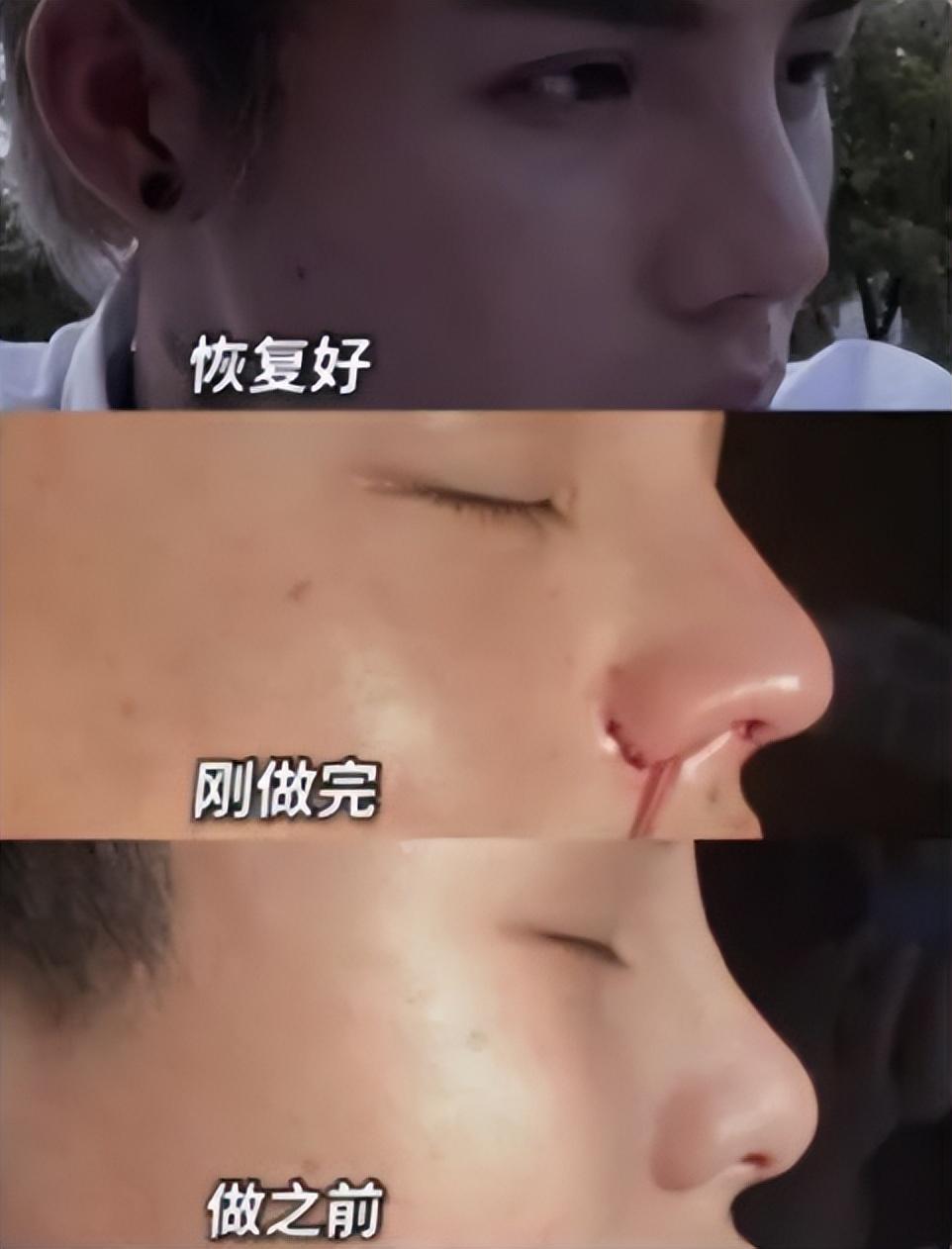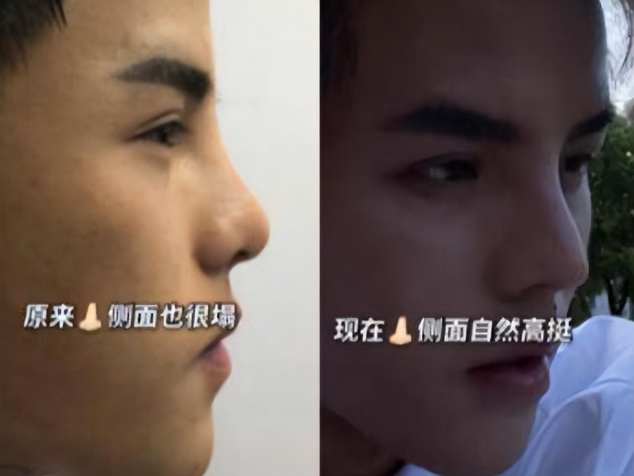 殷世航先晒出了手术前手术后鼻子的对比照片,从照片上看,他以前的鼻翼很宽,鼻孔十分明显,鼻头肉肉的,整个看上去是塌陷的状态,不太好看。而在侧面看仍旧是塌下去的感觉,侧颜也看不出立体来。
