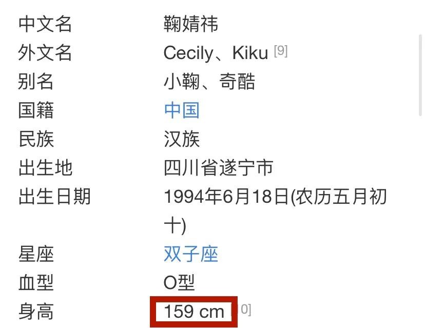 翻看鞠婧祎的百度百科,身高一栏写的是159cm,这一米六不到的身高依旧有不少人质疑。