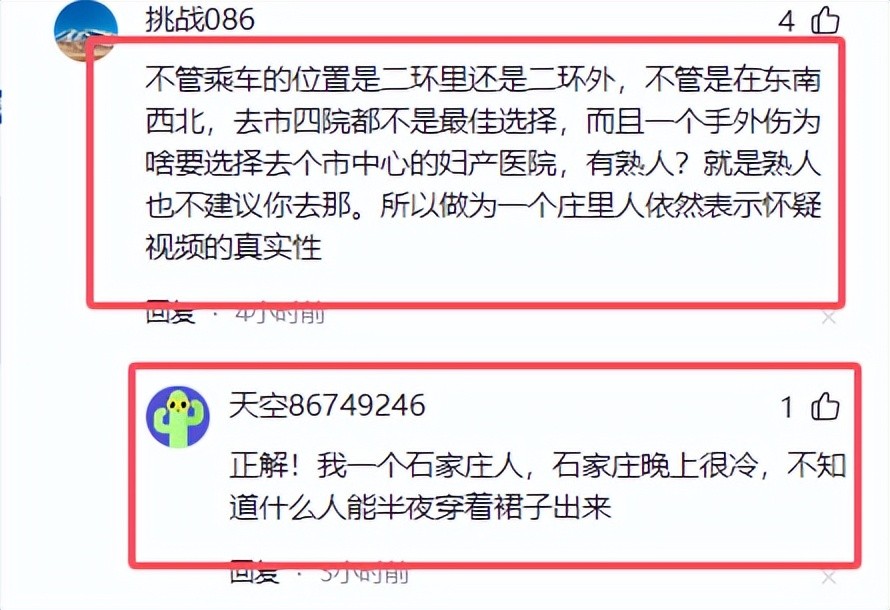 “不管乘车的位置是二环里还是二环外,不管是在东南西北,去市四院都不是最佳选择,而且一个手外伤为啥要选择去个市中心的妇产医院,有熟人?就是熟人也不建议你去那。所以做为一个庄里人依然表示怀疑视频的真实性”