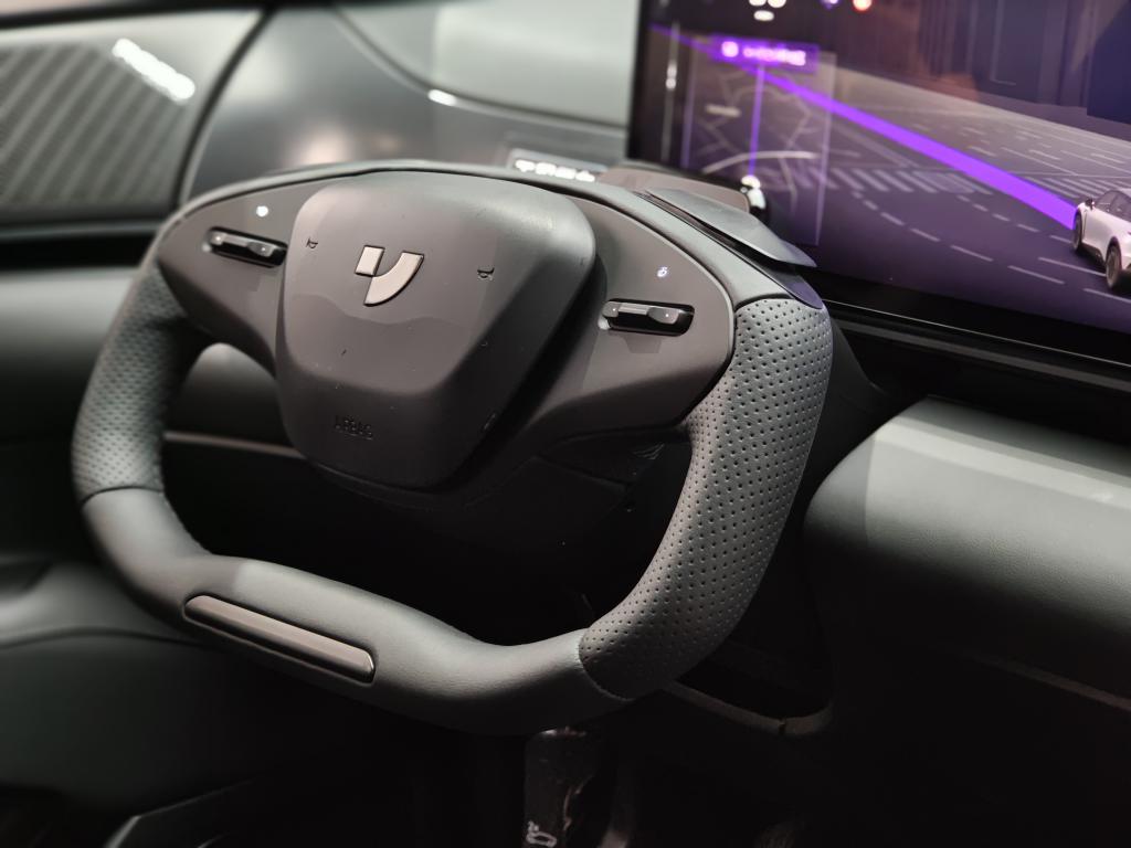 ROBO-01 同样采用了半幅方向盘设计,其目的是避免对上方车机屏幕内容的遮挡。它的按键布局跟特斯拉 Yoke 又有些许不同,我更希望用 " 游戏手柄 " 来形容这款车的方向盘。比如方向肩部两边分别有一个按键,推测是转向灯。不过新车仍有调整空间,并不代表最终就是转向灯。