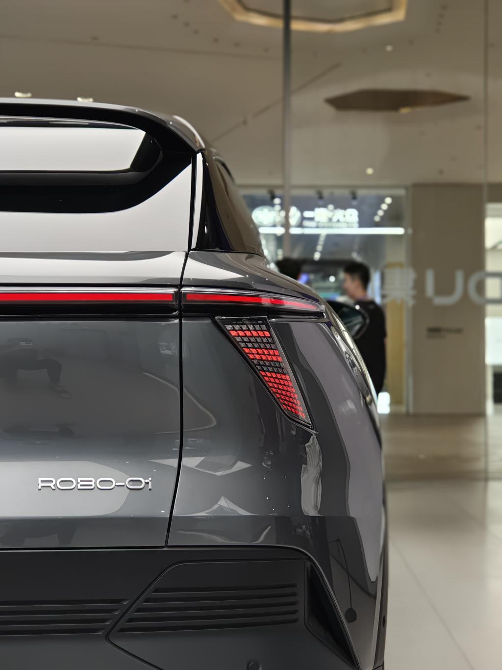 首先映入我眼帘的 ROBO-01,是一个类似福特电马的 " 轿跑 SUV" 跨界姿态,这样的气动外形意味着它在行驶过程中拥有更小的风阻,从而实现更长的续航。据介绍,ROBO-01 的风阻系数达到 0.249,是 SUV 中相当优秀的水平。
