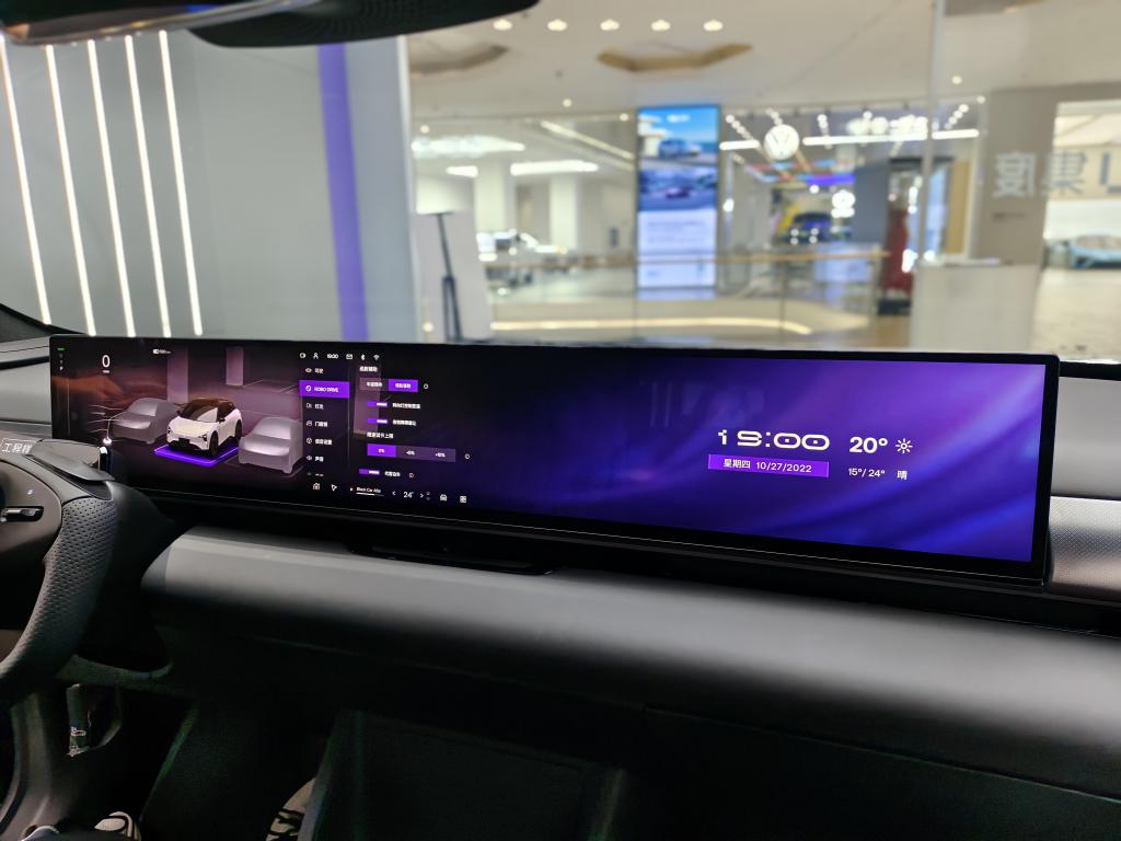 前方这块超宽一体显示屏十分 " 出戏 ",横跨主副驾驶位。据介绍,这块屏幕日常将会智能划分显示区域,最多可分成三个。无奈现阶段没有完整的车机系统供体验,我们只能从演示动画中一览 ROBO-01 的车机形态。