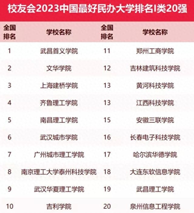 现在,让我们来看看,校友会最新发布的中国最好民办大学排名1类20强榜单。