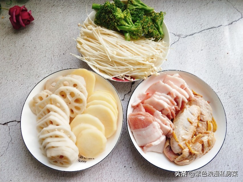 莲藕和土豆去皮切片,五花肉切片,鸡翅用刀正反面划几刀,放盐,料酒,姜丝,腌30分钟以上。