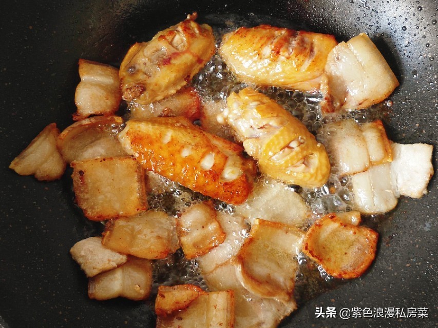 步骤四:锅中放油,放五花肉煸炒出油,鸡翅两面煎黄,放一勺料酒去腥。