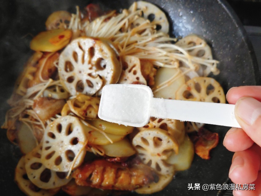 步骤六:倒入土豆,金针菇,藕片,放适量的盐翻炒。