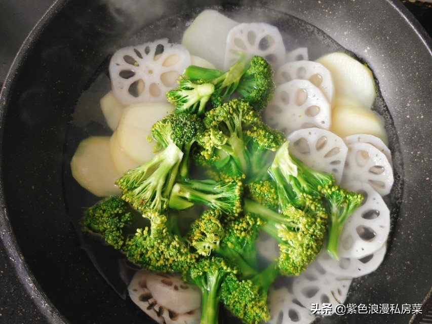 步骤三:锅内放清水,水开后放入藕片,西蓝花,土豆片,焯水后捞出,西蓝花焯水放凉水中浸泡,防止变色发黄。