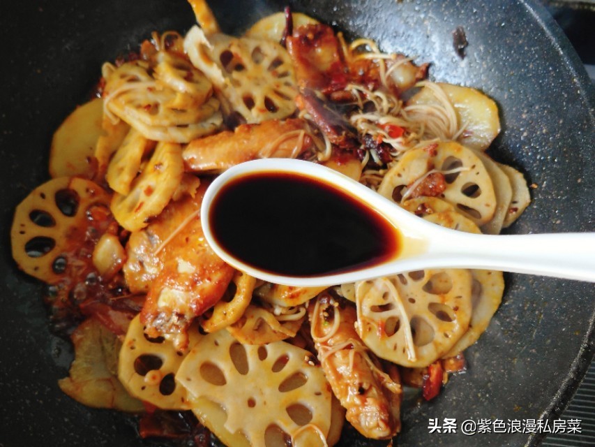 步骤七:放一勺生抽翻炒。