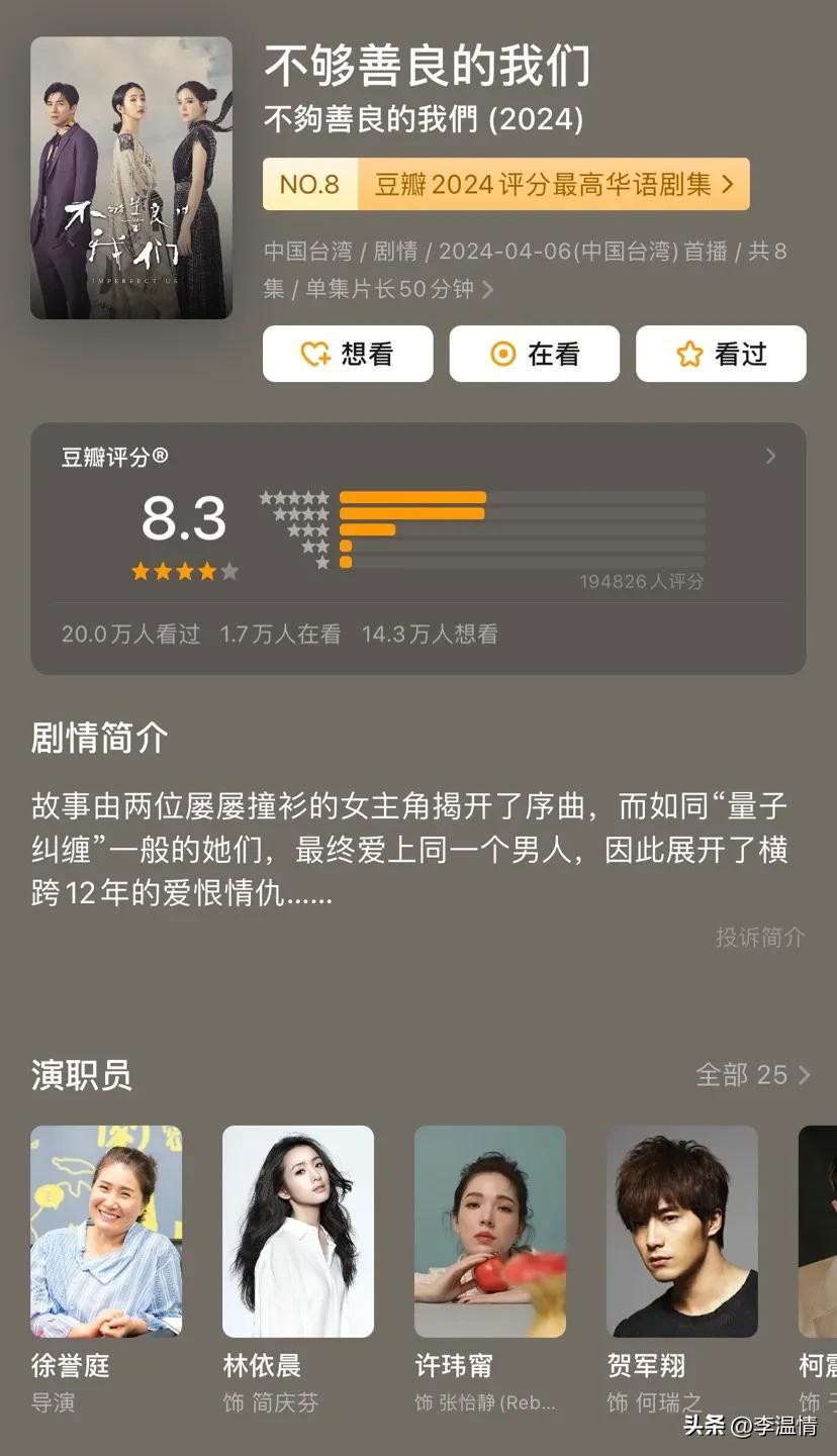 8.3分的台剧《不够善良的我们》是女性题材佳作,通过两位女性不同的人生选择探讨“生活没有标准答案”,细腻地触动观众的内心。