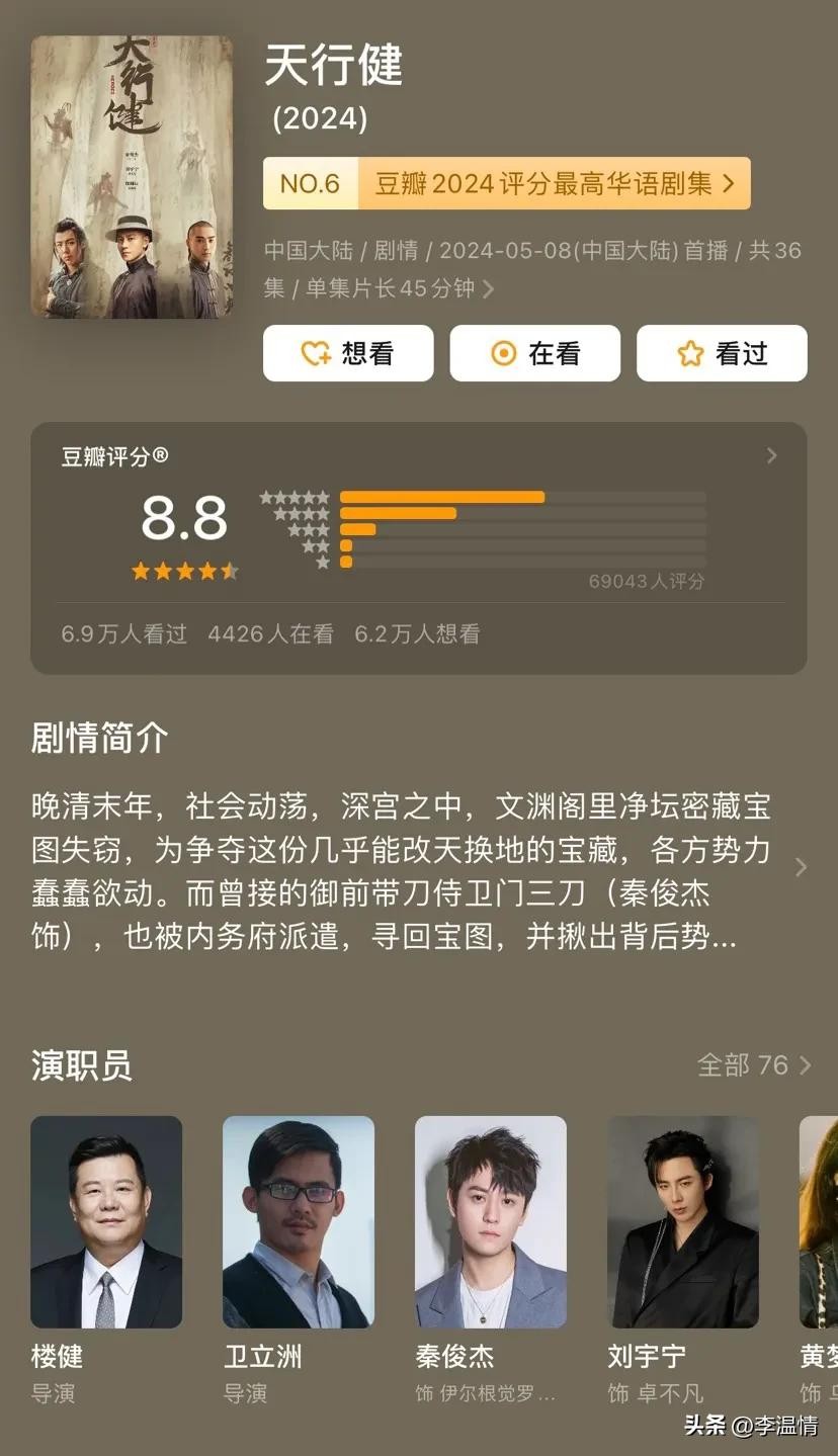 8.8分的《天行健》是清末民初武侠题材剧,剧中侍卫、剑客、捕快三人在乱世中的纠葛,探讨了人性与家国主题,其群像刻画和反套路剧情广受好评。