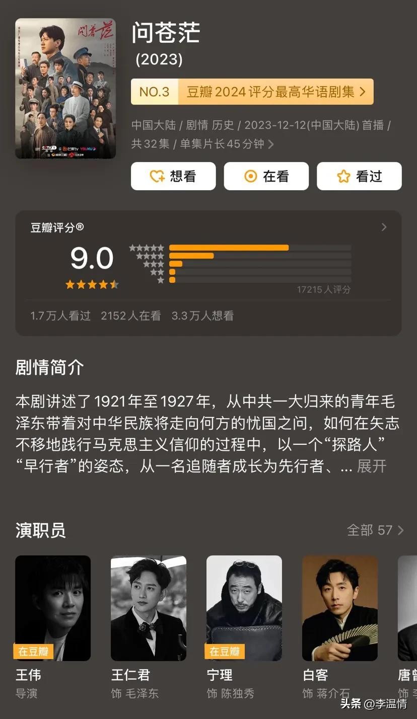 同样表现出色的还有9.0分的《问苍茫》,作为历史剧里的“扛把子”,它讲述了青年毛泽东的革命探索之路。扎实的剧本加上深刻的家国情怀,让观众们产生了强烈的情感共鸣。