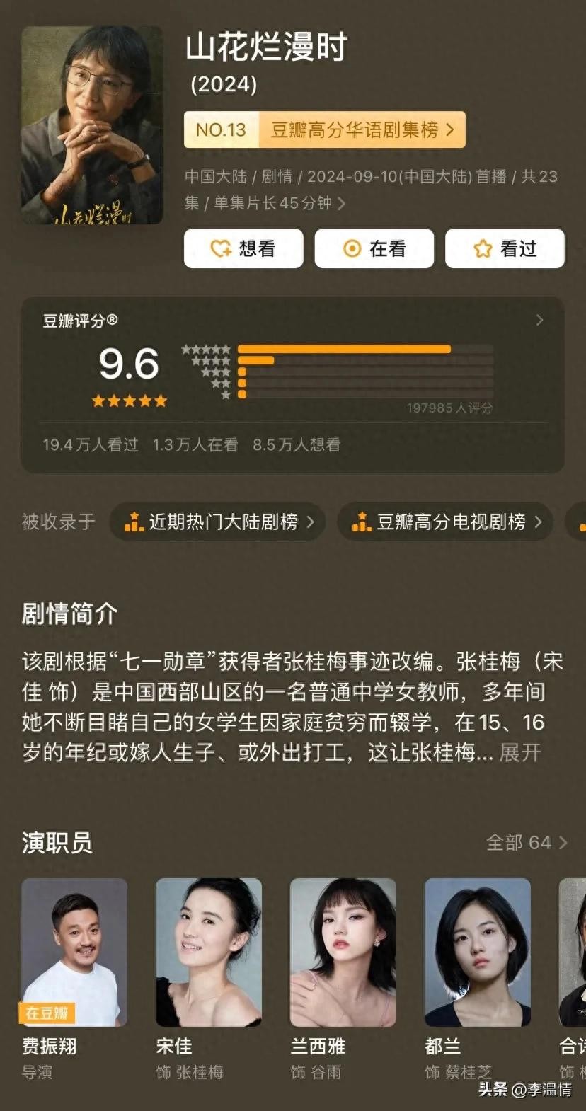 首当其冲的是9.6分的《山花烂漫时》,它改编自张桂梅校长的感人事迹,聚焦贫困山区女性教育成长。凭借细腻的叙事和感人细节,这部剧成功地打动了观众,堪称“年度催泪弹制造机”。