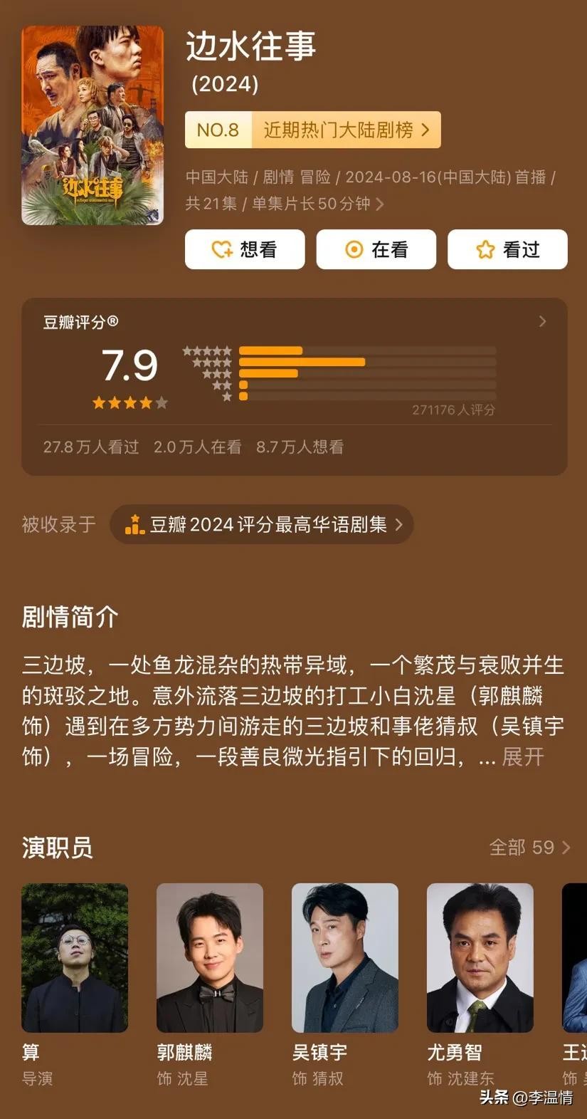7.9分的《边水往事》是曹保平执导的犯罪题材剧,揭露了东南亚边陲的混乱与人性挣扎,但郭麒麟的演技存在争议,给这部剧拖了后腿。