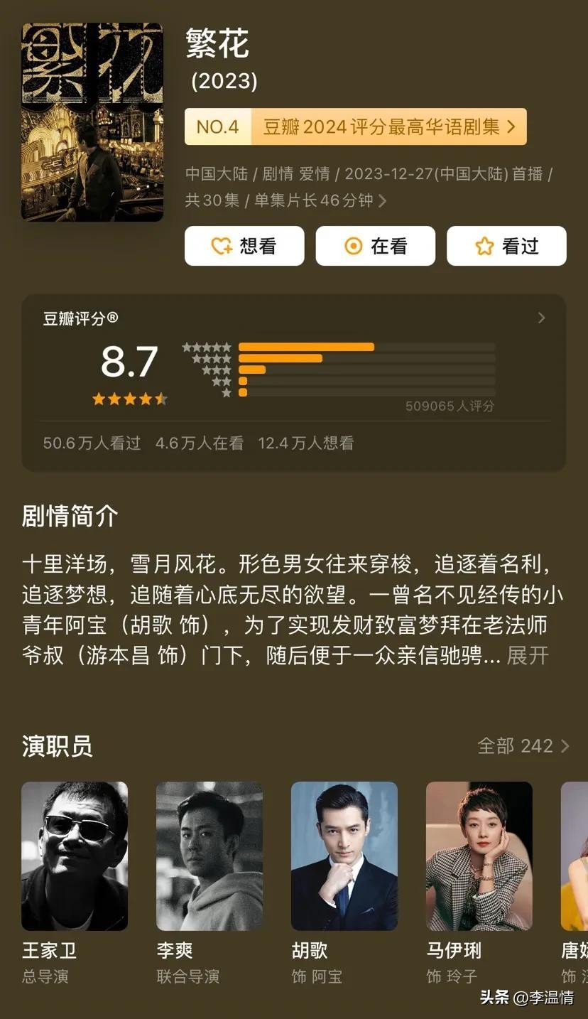 8.7分的《繁花》由王家卫执导,这是他首部电视剧作品,带着电影级镜头语言,完美还原了90年代上海的商战风云。胡歌、马伊琍等演员的精彩表演,让观众能够“沉浸式”入戏。