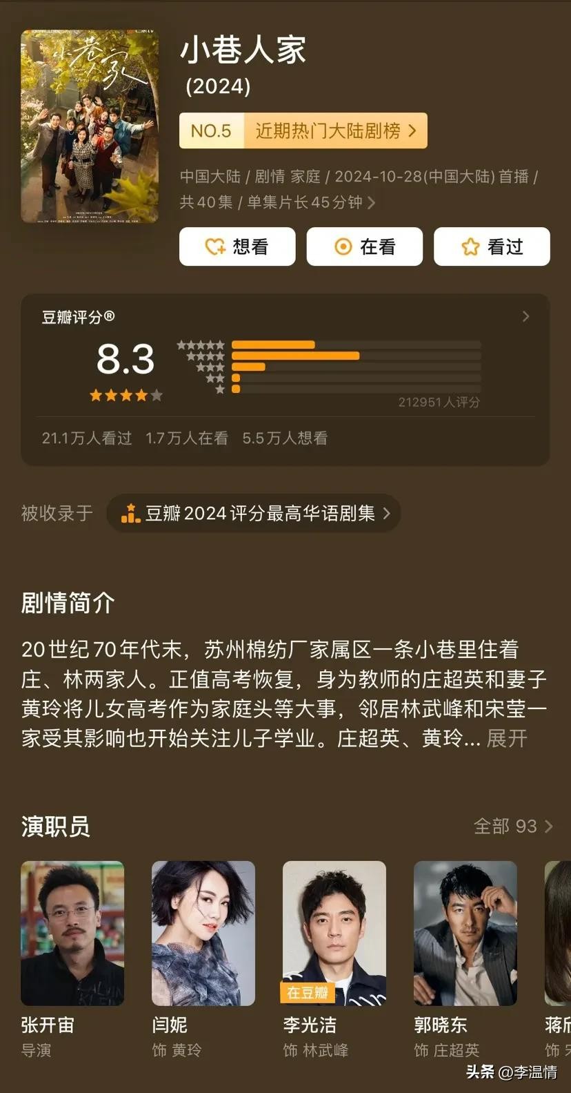 8.2分的《小巷人家》由正午阳光出品,这是一部以苏州小巷为背景的年代剧,它将改革开放初期的家庭温情刻画得入木三分,年代还原度极高。