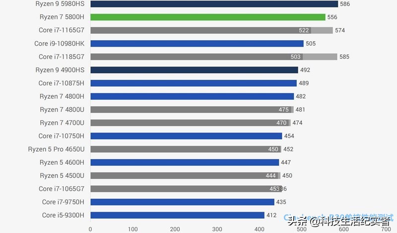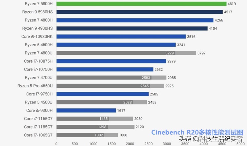 因为采用了最新的Zen 3架构,为此带来的IPC优势,在多核性能测试中R7-5800H可以说是力压群雄。
