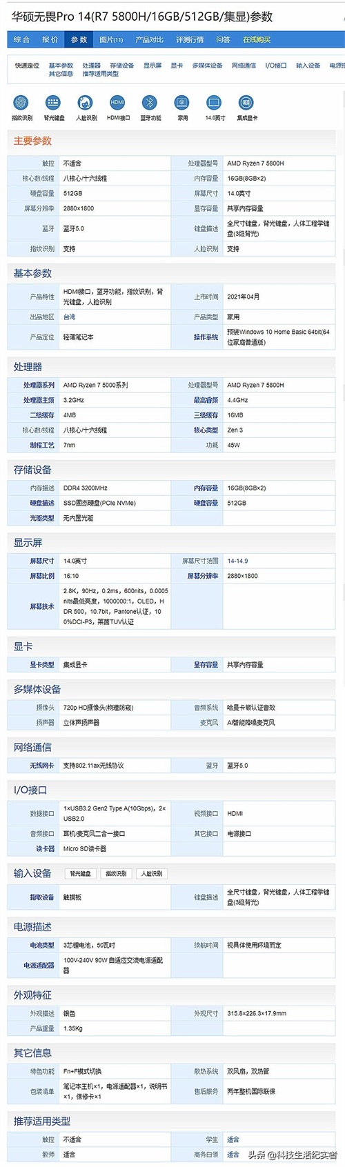 华硕无畏Pro14也是搭载AMD的5000系列处理器R7-5800H,其基准频率为3.2GHz睿频可达4.4GHz。屏幕搭配14寸的2.8K屏,具有90HZ高刷新率,100%sDCI-P3。