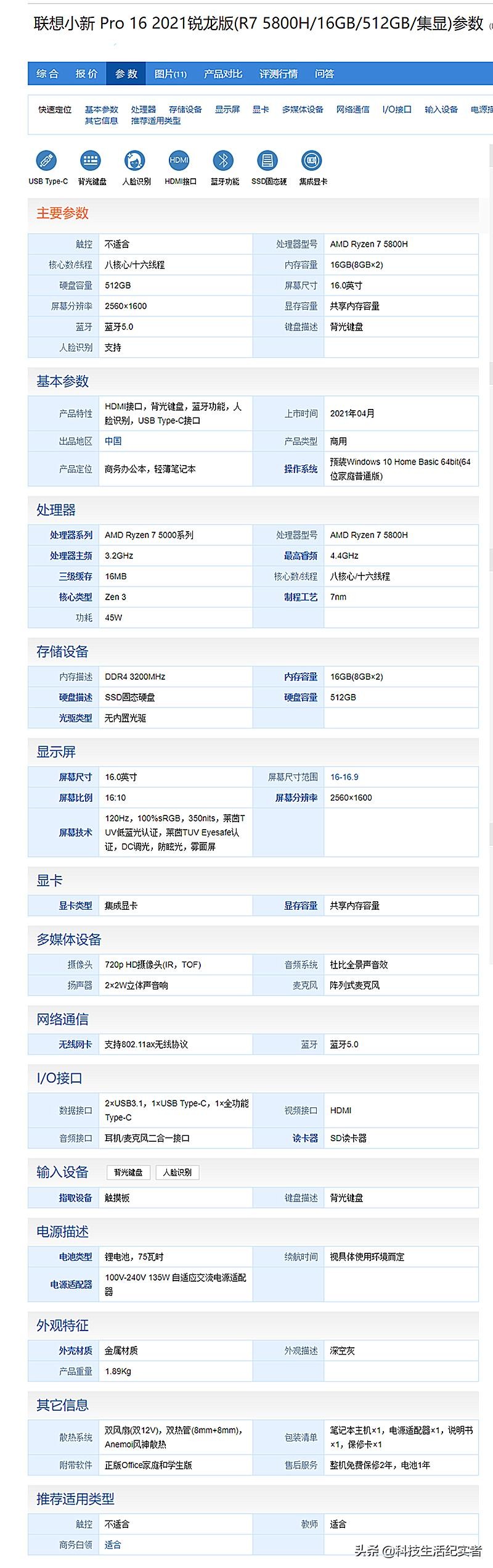 从配置参数可以看出,联想小新Pro16搭载AMD的5000系列处理器R7-5800H,其采用了8核16线程设计,三级缓存升级到16MB,基准频率为3.2GHz睿频可达4.4GHz。屏幕搭配16.1寸的2.5K屏,具有120HZ高刷新率,100%sRGB高色域。