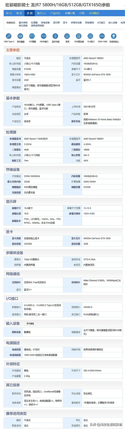 第三款:宏碁暗影骑士·龙 (R7-5800H/16G/512G/GTX1650/15.6寸144Hz)【参考价:5799元】