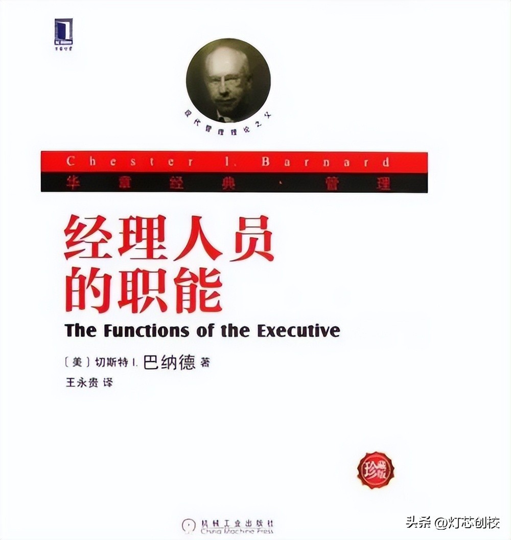 巴纳德一生有两部影响世界的经典,一是《经理人员的职能》,此书被誉为管理思想的丰碑。这本书是巴纳德毕生从事企业管理工作的经验总结,他将社会学概念用于分析经理人员的职能和工作过程,提出了一套组织理论,建立了现代组织理论的基本框架。巴纳德认为所有的组织都包含三个要素:合作的意愿、共同的目标和沟通。他从最简单的人类协作入手,揭示了组织的本质及其最普遍的规律。