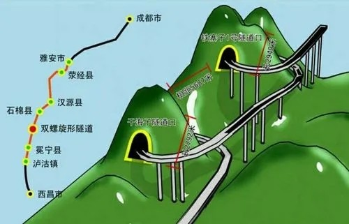 雅西高速最震撼的一段,无疑在栗子坪和菩萨岗之间。短短的直线距离,海拔要爬升数百米,高速公路的坡度所要求爬升距离不够,怎么办?基建狂魔的办法就是,用天梯高架以及拖乌山山腹隧道,构建起高架与隧道的双螺旋结构,用原地一圈一圈的螺旋形状,延长道路的长度,降低路面坡度。
