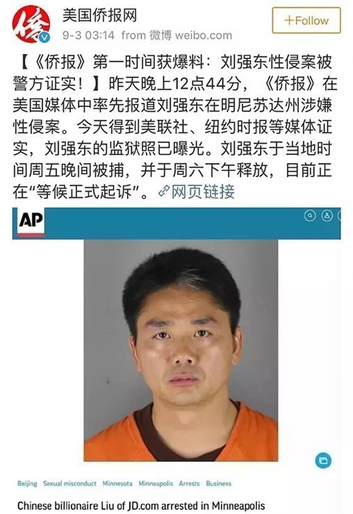 3日,据《侨报》消息,美联社、纽约时报等媒体报道证实,刘强东性侵女学生案属实,并且其监狱照已曝光。