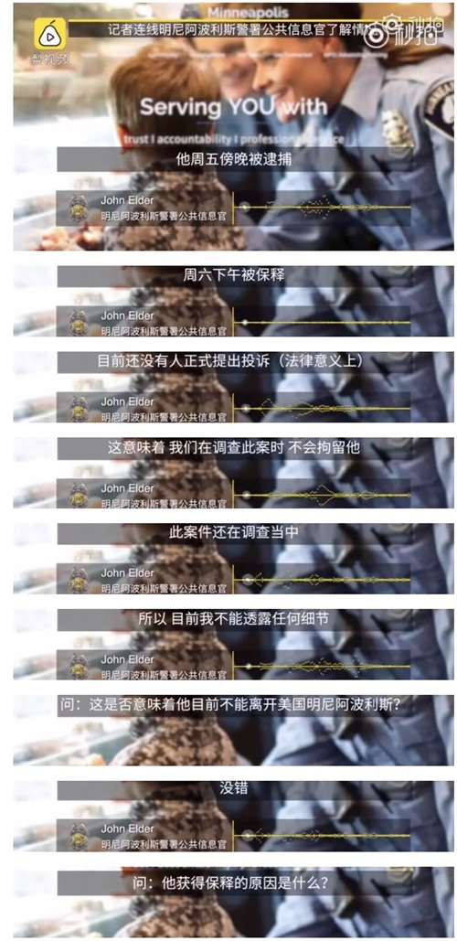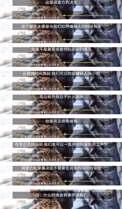 一段录音显示,明尼阿波利斯警署公共信息官JohnElder在接受外界的采访时表示,可以告诉外界的是,这名男子周五傍晚被逮捕,周六下午被保释,目前还没有人正式提出投诉(法律意义),这意味着在调查此案时警方不会拘留他,此案还在调查当中,可能会花费比较长的时间,目前不能透露任何细节。