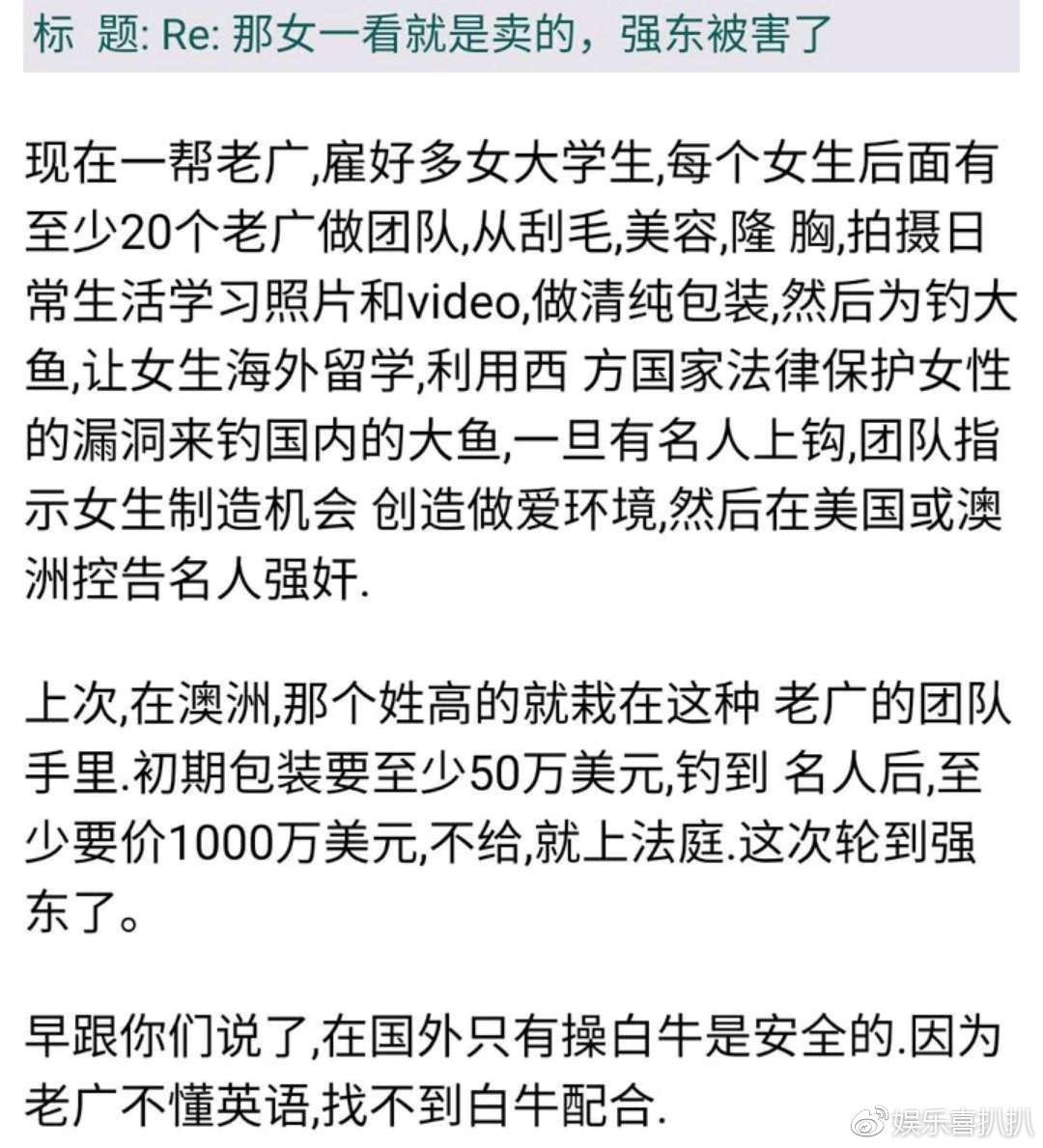 网络也有流传,这次刘强东是被设计了。国外有这么些个团伙,专门安排妙龄女孩子诱惑成功认识上钩,然后留下证据,进而进行敲诈勒索。