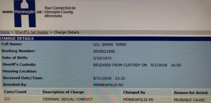 根据明尼阿波利斯警署公关信息官的说法,刘强东是在当地时间星期五傍晚被逮捕的,在星期六下午被保释。